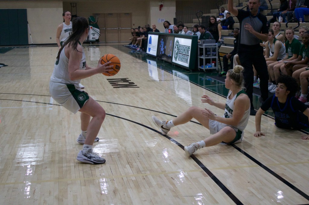 Head Piedmont Lions women’s basketball coach Jamie Purdy reacts in distaste to call in favor of the opposing Berea Mountaineers. Senior Destiny Deetz remains on the court and prepares to play defense.