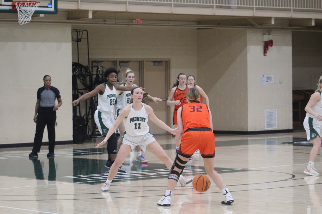 Head Coach of Piedmont’s Women’s Basketball Team Jamie Purdy responds to a call by the referee. Other players are shocked by the referee as well.