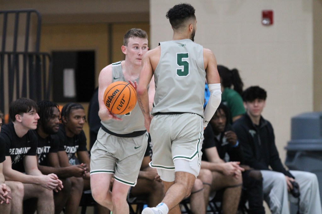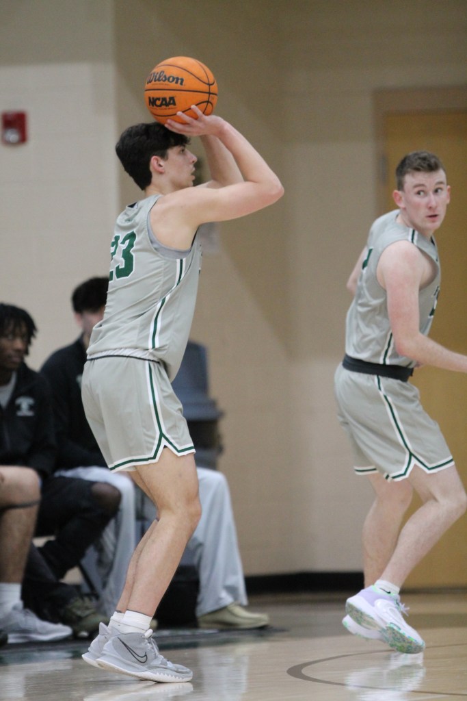 Teammates Ryan Jolly and Noah Reardon make a quick play to throw off the Berea players. By passing off the ball to Reardon, he dribbles to the top of the key and makes a three pointer.