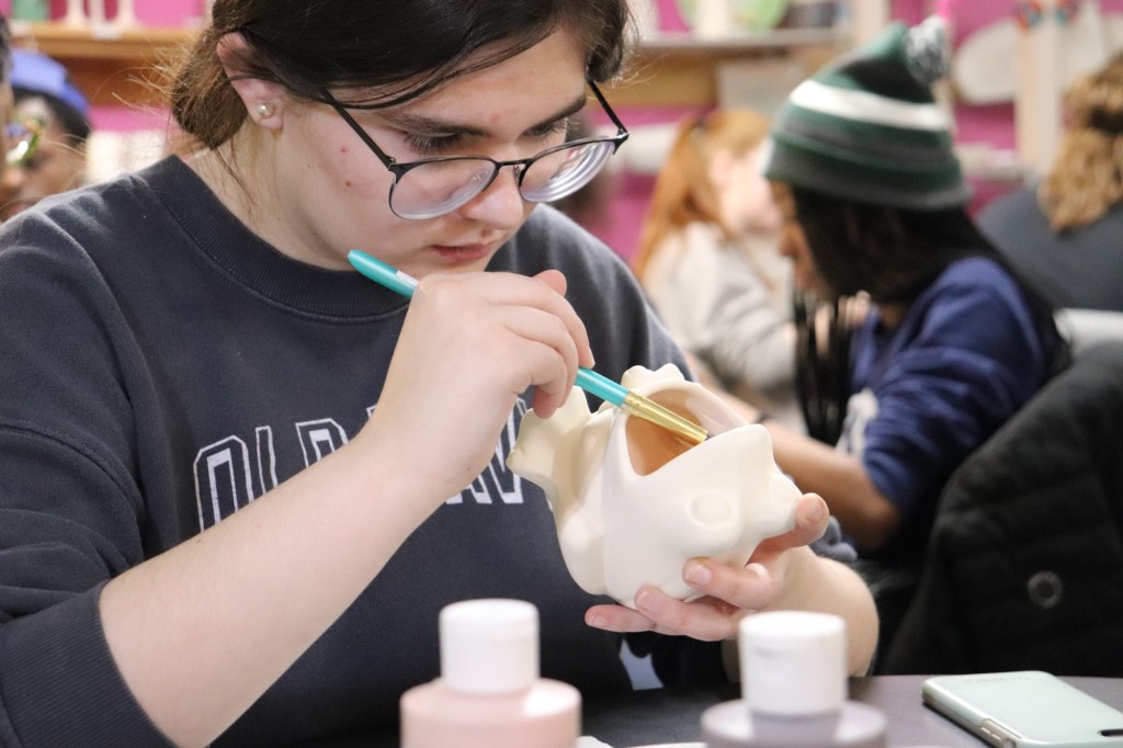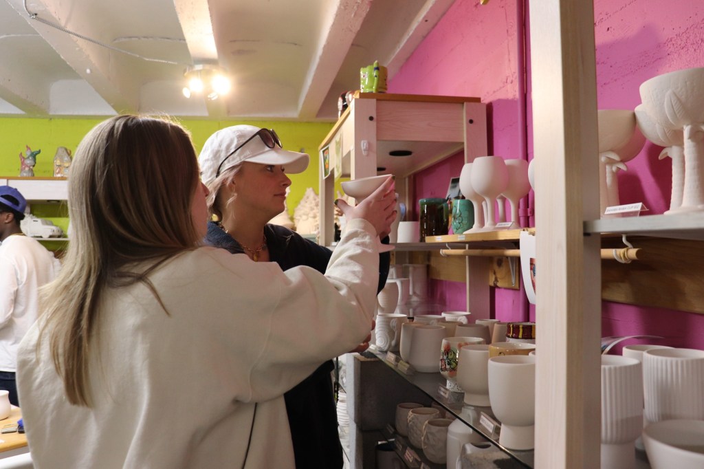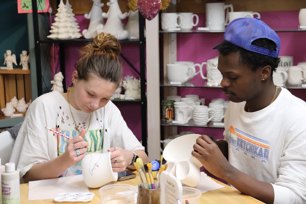 Picking a piece of pottery is the most difficult part for some. Students Hannah Franks and Amelia Esther look through the many options; Splashe Art Studio offers a wide variety of pottery options, ranging from practical tableware, to fun decorative pieces. Focusing on the details, Brianna Fortner carefully paints the inside of her ceramic frog. Glazes become more vibrant after firing, and three coats are usually required to get a fully opaque look. Splashe is also a great date night location! Students Maggie Bishop and Draylon Starks take this opportunity to go on a date. At this CAB hosted event, students got a discounted price of $15 per person- a great deal for a fun activity!