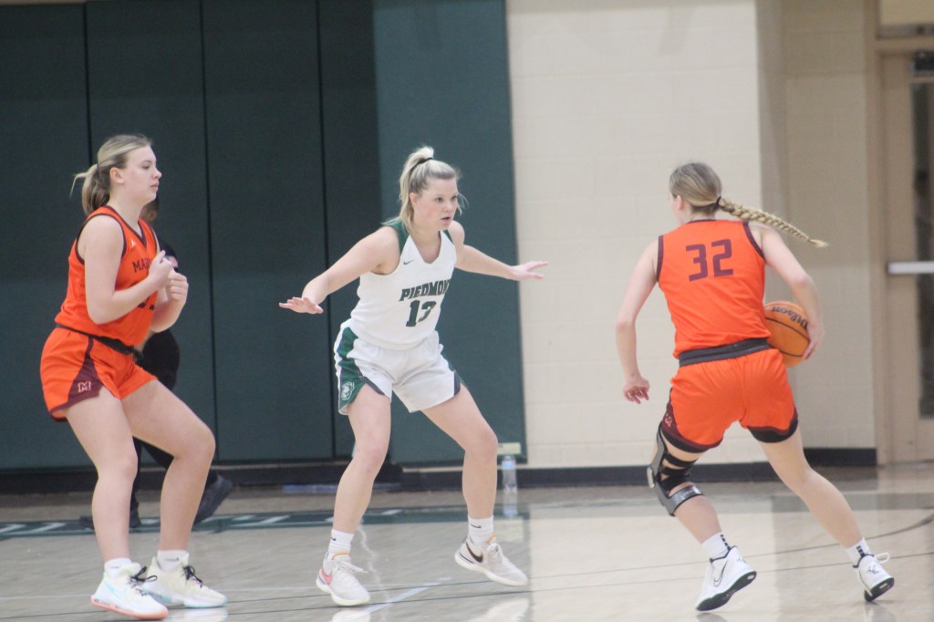 Piedmont University guard, Kennedi Henson, defends the basket from a Maryville player.