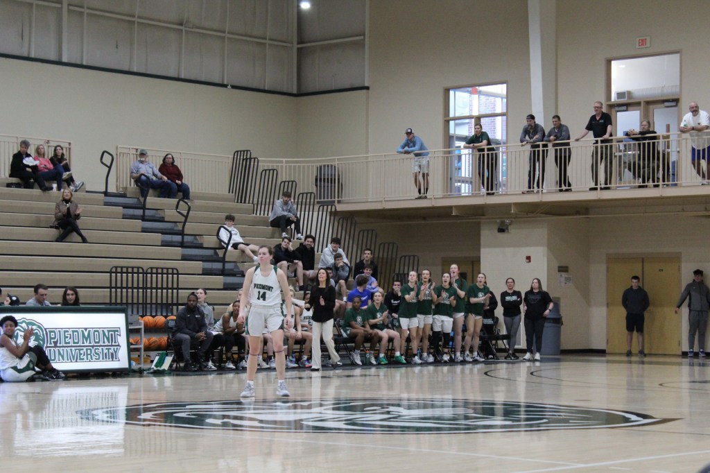 Colby Reed, guard for the Piedmont Lady Lions waits up court for the next play to develop as the Lions’ bench behind her erupts in cheer. All 11 of Reed’s points came in the first half off 3-point shots.