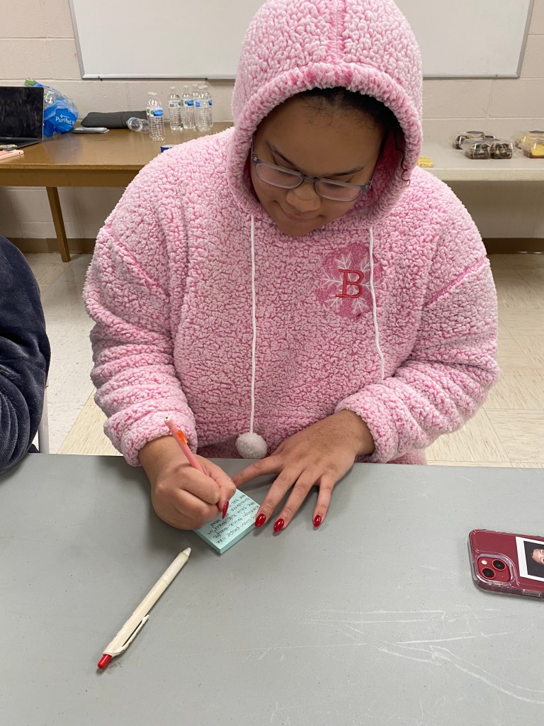 Purcell Hall RA Khiyah Tate sets up the “Spill The Tea” event where students are able to come in and write down whatever they have on their minds. They then put their post-its in a box to get rid of the negative thoughts.