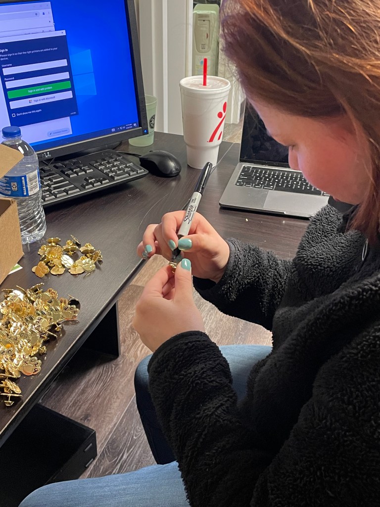 Ella makes outlines for PAL game pins at work before heading to her radio show