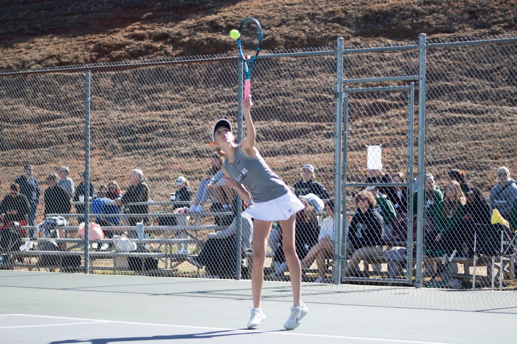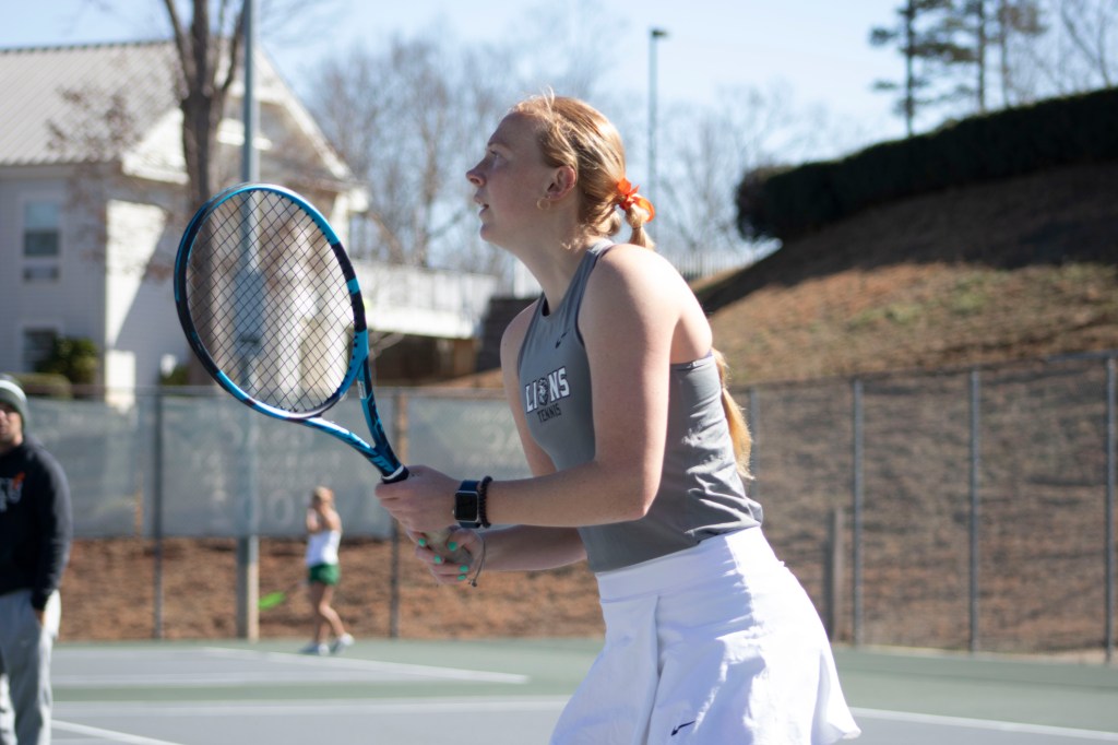 Senior Marion Sloyan getting ready to hit a volley. Eventually she hits the volley and wins the point for the lions.