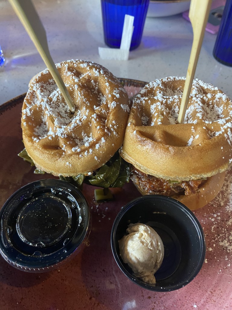 I spent my spring break working, eating, and enjoying nature. The first picture is from a restaurant called Just Brunch I got the Cone Bread Waffle stack, Which has Waffles with Korean Barbeque Chicken and Collard Greens. The second picture was when I was at work, and 30 minutes into being checked in this little girl fell asleep in a basket. And the last picture is of me standing around at the park after I got finessed by the ice cream man.