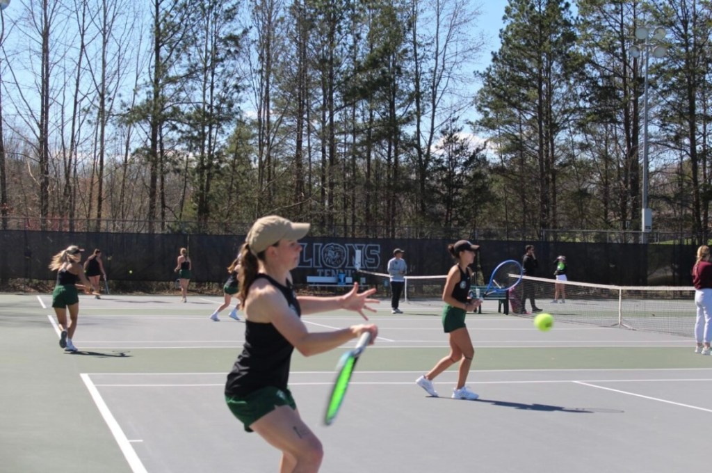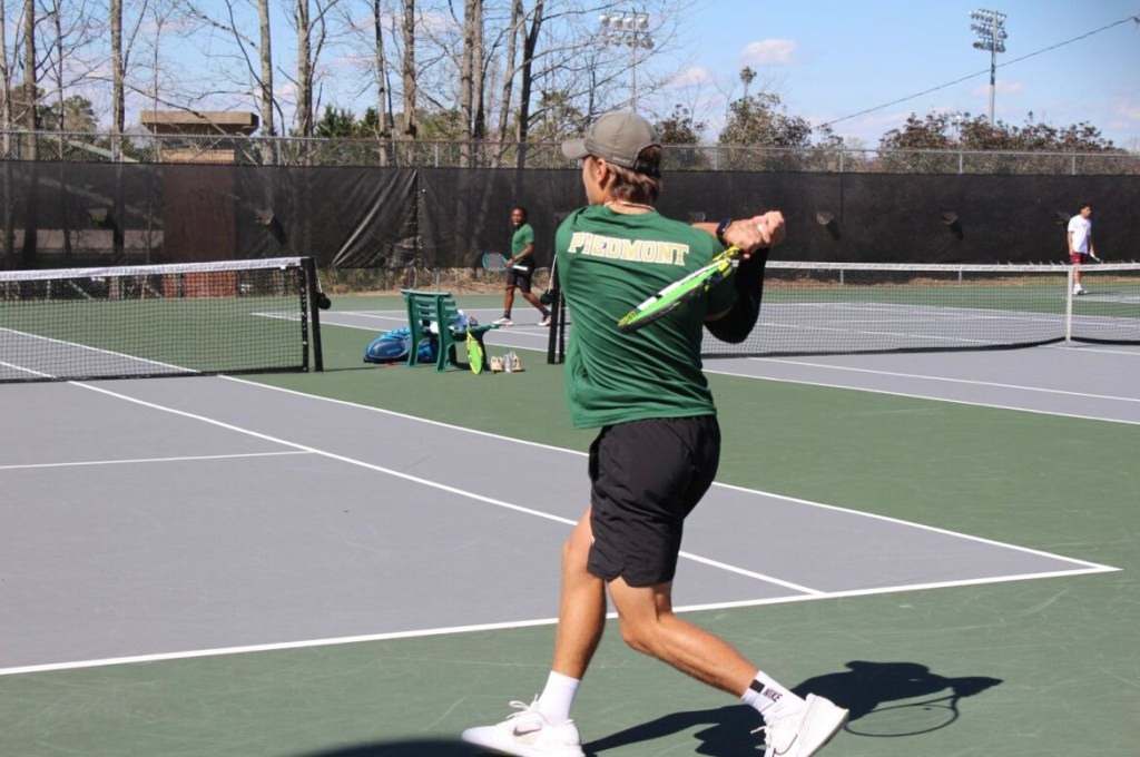 Freshman Mark Backeberg returns the serve from Salisbury player. Eventually Sophomore Yannick Wassmer Navarro and Backeberg received the point because the Salisbury player was unable to reach the ball.Freshman Yannick Wassmer Navarro running to hit the volley. Navarro was trying to win the match for Piedmont, unfortunately the Lions fell short to Salisbury University, 7-5.Senior Abbey Grace Venham help Piedmont gain there first point of the match with her doubles teammate, Junior Bri Laidman. Venham responded back with force and Salisbury couldn’t comeback from their deficit.