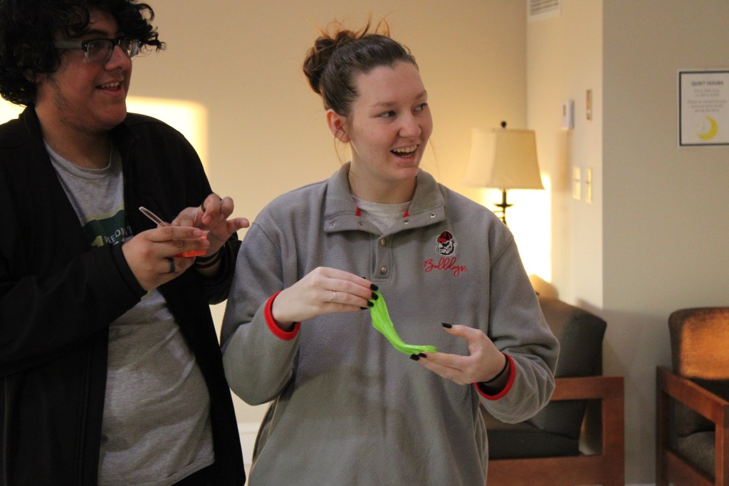 Sophomore Chelsey Taylor and Henry Avila talk with another RA about making their slime. Chelsey Made lemon scented green slime, thats she’s playing with. Henry made coconut scented orange slime, that he’s still mixing.