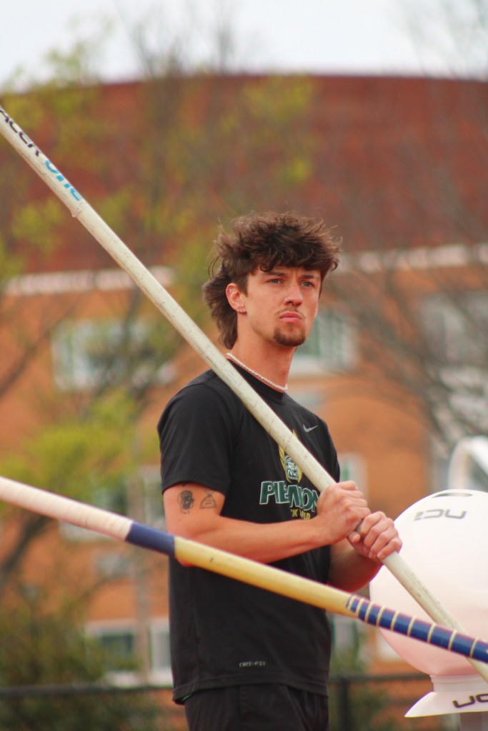 Senior Wes Rogers looking at the wind gauge as he begins to warm up for pole vault. Due to the strong wind, he fouled all 3 attempts at his first height, thus removing him from the competition.