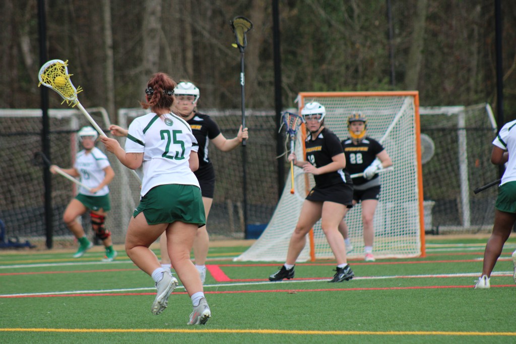 Junior Aly Reece looks to decide whether to drive toward the goal or pass the ball off to senior Maggie Spratlin. Reece and Spratlin carved up the Pfieffer defense, creating opportunities for the Lions to score a total of 16 goals in the contest.