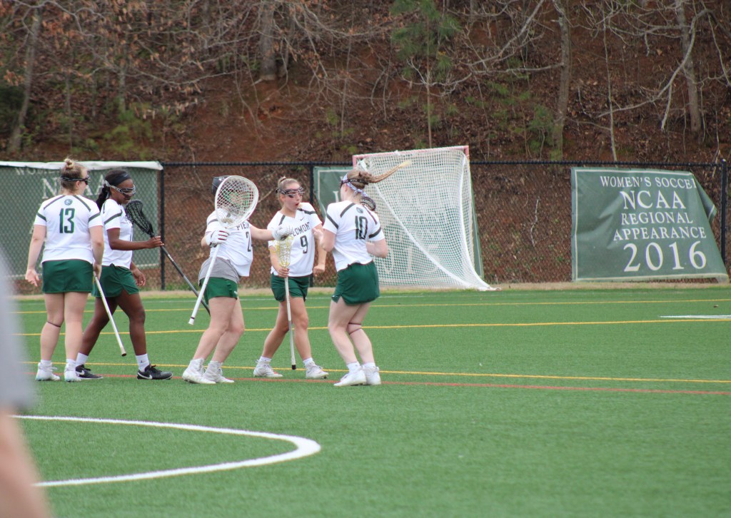 Piedmont women’s lacrosse defenders Noelle Poteete (9) and Jaiden Ramatowski (10) celebrate the most recent goal by dancing on the other half of the field. The Piedmont Athletics Department plays 2000s pop songs after a Lions goal to bring energy to the team and encourage a scoring streak.