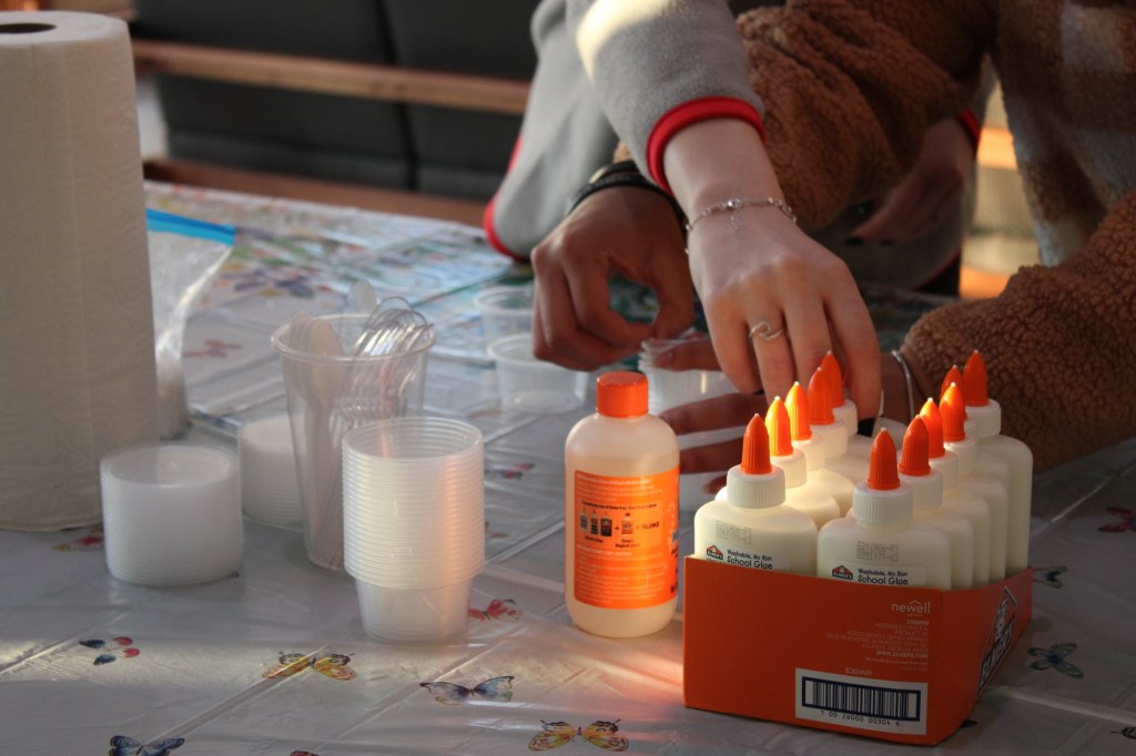 Piedmont University students Delyna Fuller and Chelsey Taylor gathered the supplies needed to make their slime at RA Lizzie’s “Relieving Stress with Slime” event.