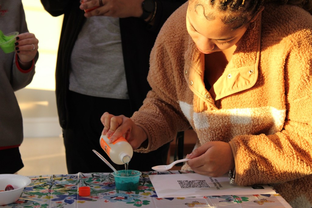 Delyna Fuller carefully adds activator to her slime. Too much activator makes the slime stiff.
