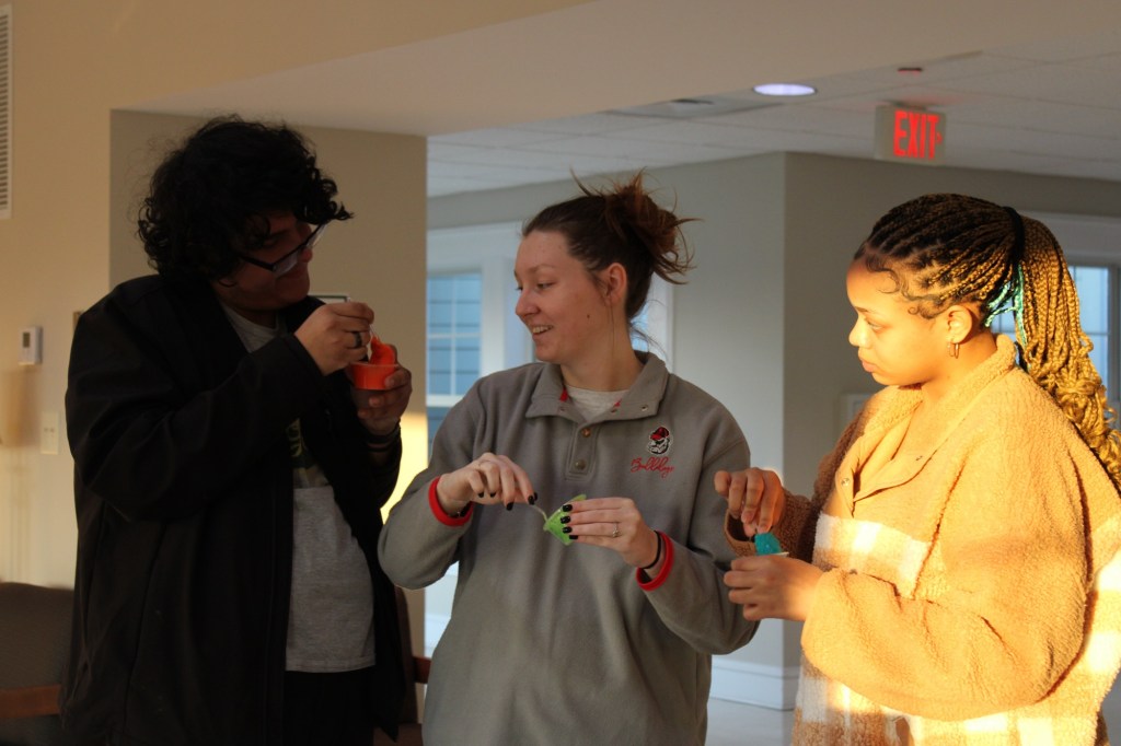 Delyna Fuller and Chelsey Taylor were joined by their friend Henry Avila. They were finishing up their slimes by mixing and stretching them.