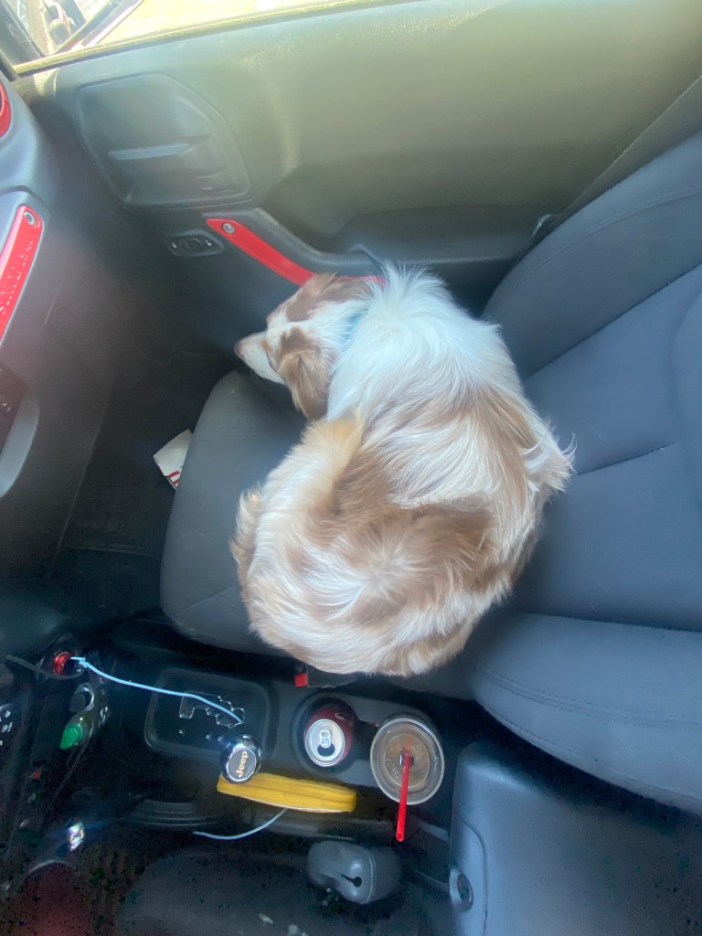On my way home I let Eros sleep in the front seat. After awhile he curled up into a doughnut, and slept the whole ride home. The house we stayed at on Sunday had three cats, so Eros was very tired.