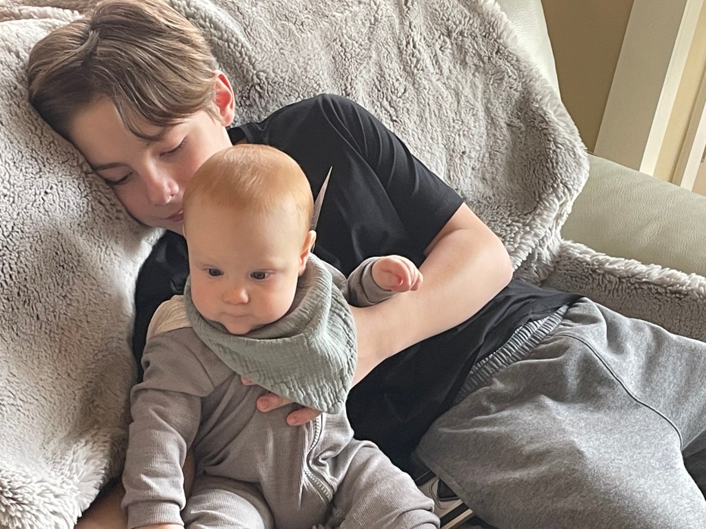 Both nephews of Luke Micham, Toby and Tommy lie together to spend time together as brothers. With Toby being 6 months old, Tommy needs to hold him up to keep him from falling.