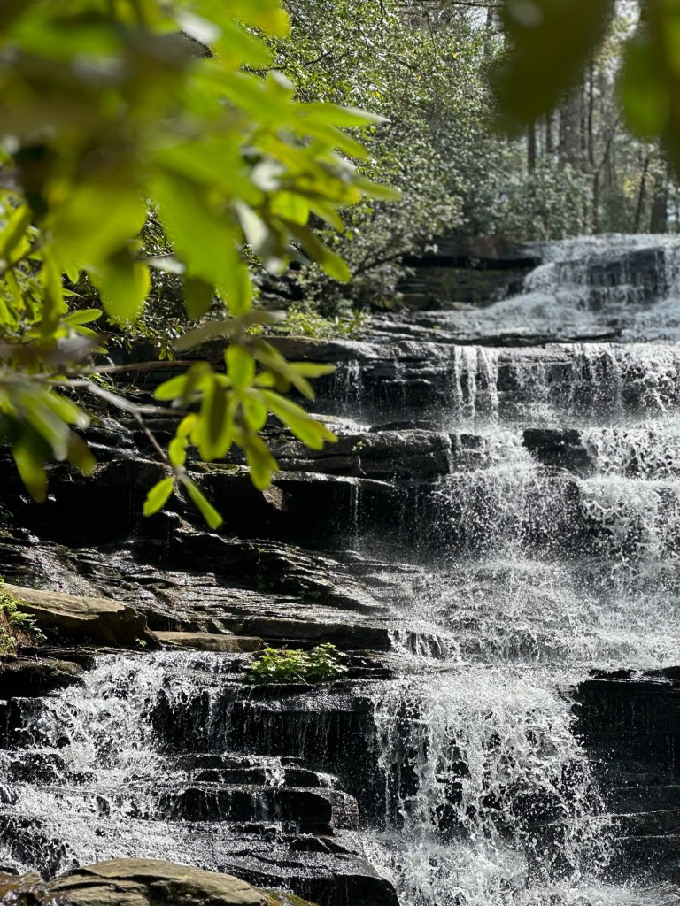 Creating depth by focusing on the waterfall behind the leaves from above. Using shadows and sunlight to show detail on the small leaves. The capture of the whole water fall and its unique qualities. Capturing the water movement overtop a small rock aside the waterfall.