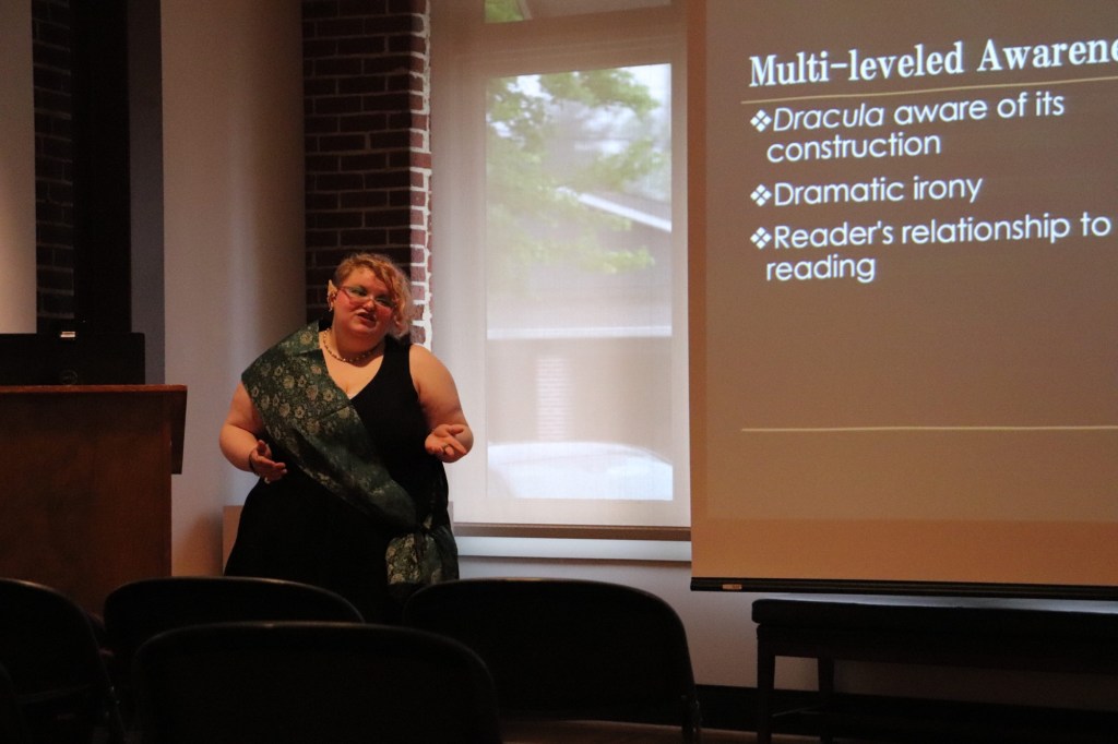 Symposium is a day of research presentations, ranging from poster boards to PowerPoint presentations. There were over 400 presenters this year. Olivia Martin, Junior, presents her presentation on Dracula. Dracula has a giant impact on today’s society, and many of its storytelling techniques are still used today! Matt Kodrowski emcee’s the Red Carpet Magic event, unveiling Piedmont University’s short films. Kodrowski led Q&A’s, giving the audience a sneak peak of behind the scenes struggles and funny moments from the film.