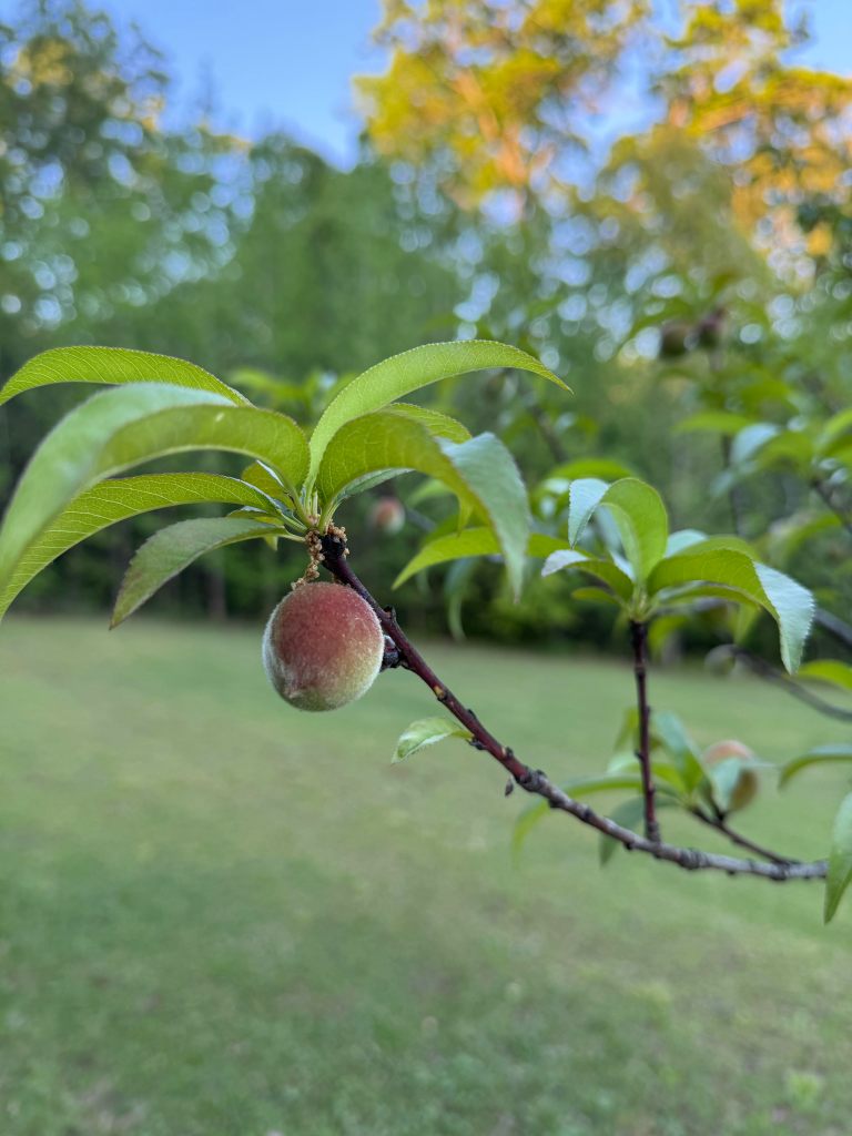 My grandma and I were walking the dog outside and found that her peach tree are starting to grow peaches on them. I thought it was cool so I took a picture of it