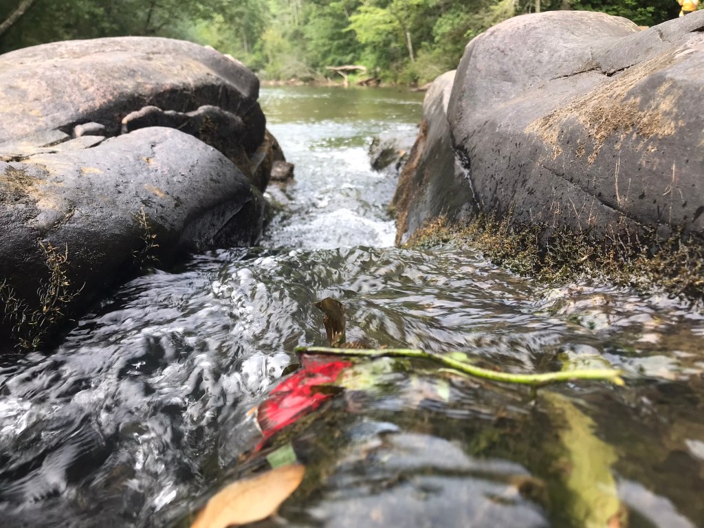 Here is a close up shot of a red leaf is in place of the running river in Tallulah Falls Park.
