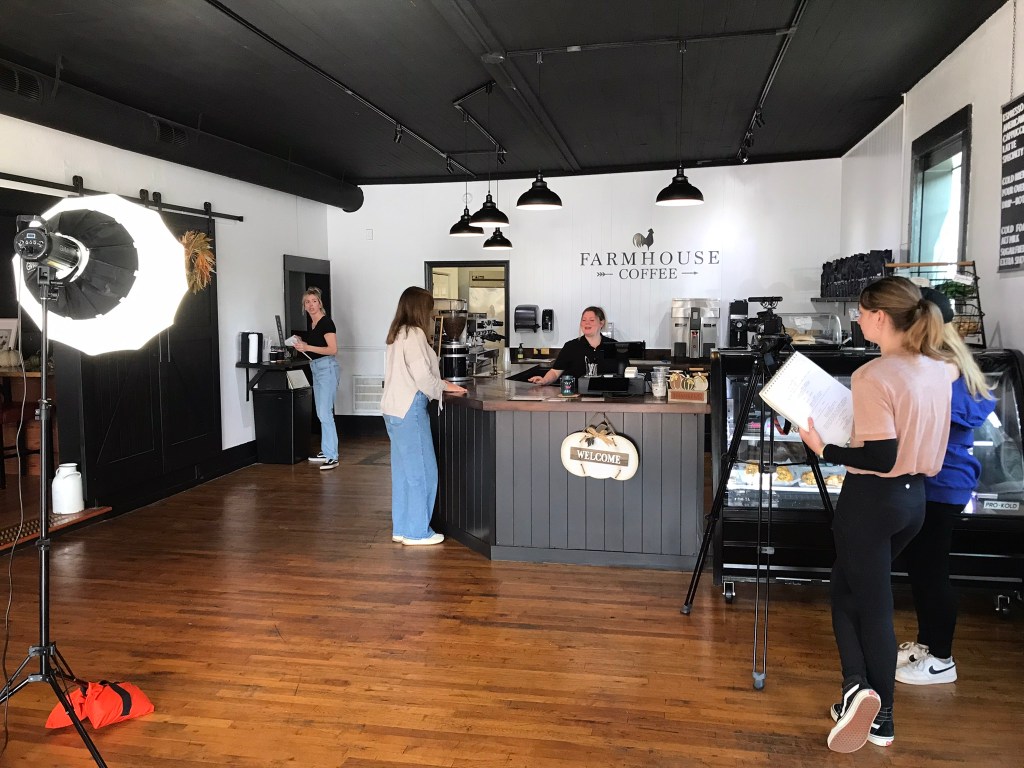 In the long shot, on the film set of the short film “Pinky Promises,” a capstone project for senior Maggie Bishop. Location is the local coffee shop Farmhouse from left to right, Mackenzie Cain, Laurana Layton, Haylee Collins, Maggie Bishop, and Sophie Haines.