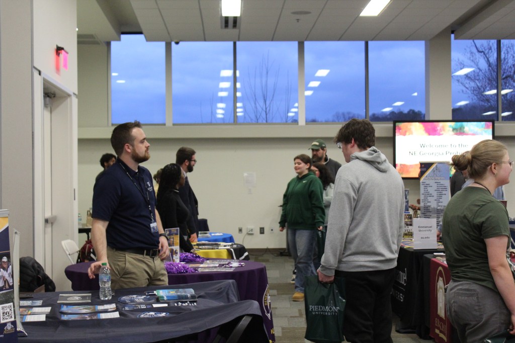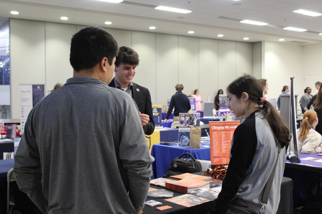A high schooler and her father talking to the representative of Mercer University about their major programs. There were multiple colleges and universities present at the Probe Fair.