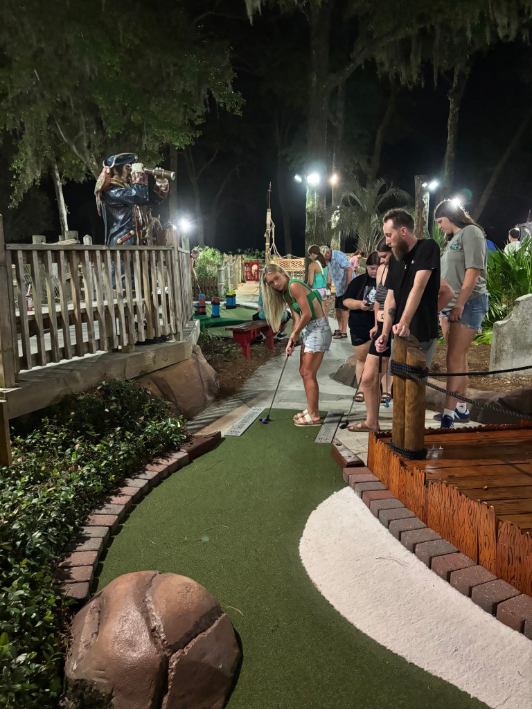 Kate Sanderlin lines up a putt at Pirate’s Cove Adventure Golf in Hilton Head while on vacation. Also pictured are Tristan Bailey, Julie Sanderlin, Maura Long, and Maggie Reid. The group spent the evening laughing, competing, and making memories together, enjoying one of Hilton Head’s most popular mini golf places.