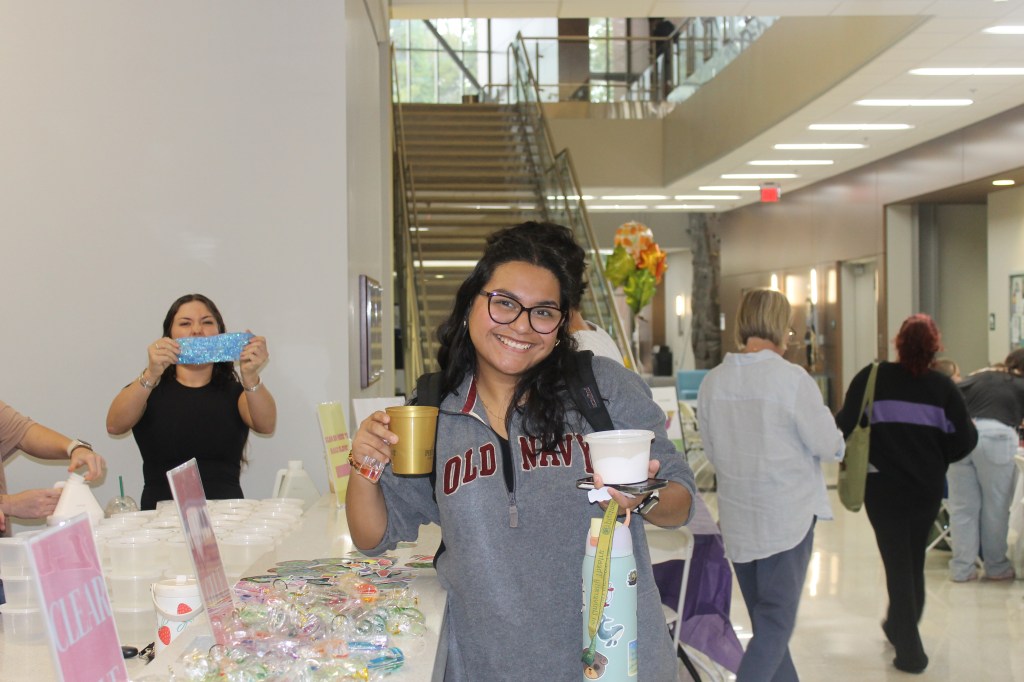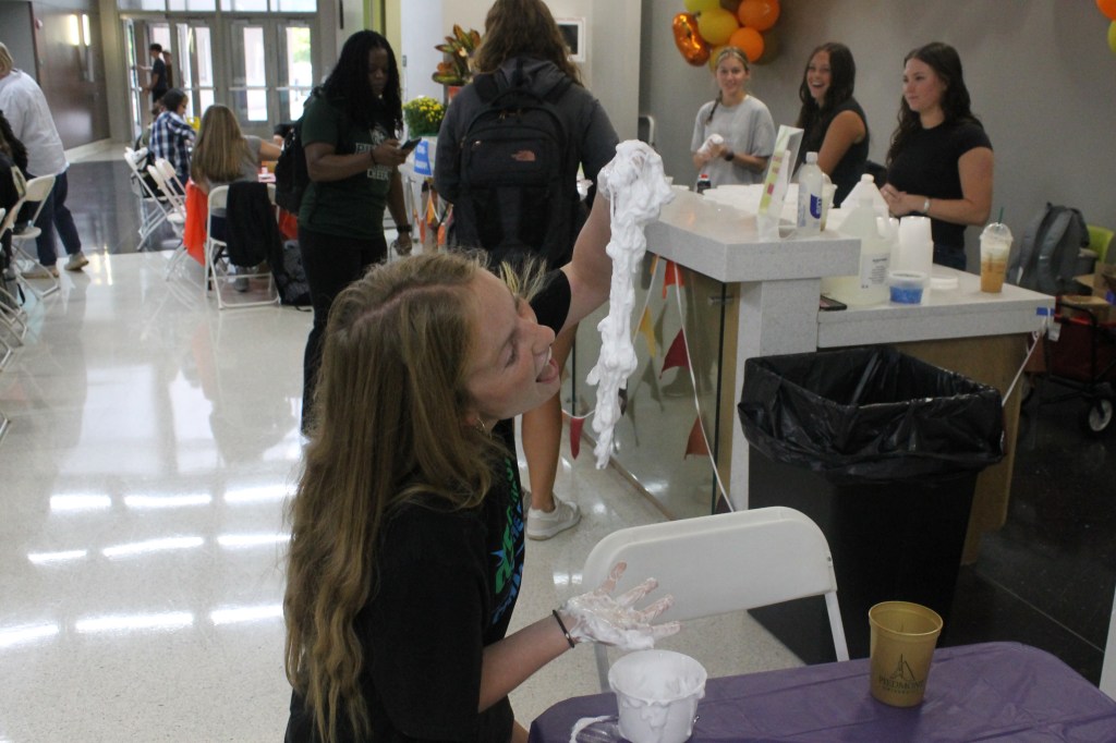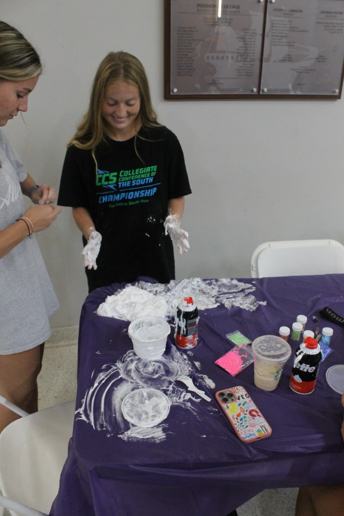 A dramatic scene as junior Gretchen Dedolph is seen making slime that seems to be making a bit of a mess. A look of frustration from freshman Abby Waldrop as she struggles to get her slime to actually slime. Interesting imagine of junior Gretchen Dedolph attempting to eat her slime stating “It looks like whipped cream.”Piedmont student attending campus event making slime and a lava lamp. This student is very excited to be in attendance.