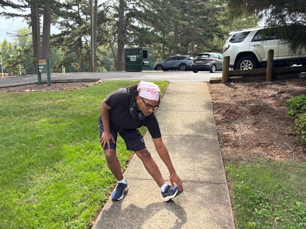 Jaden Grey stretches before heading to class, getting ready for the day ahead. He looks focused and calm as he prepares to move.