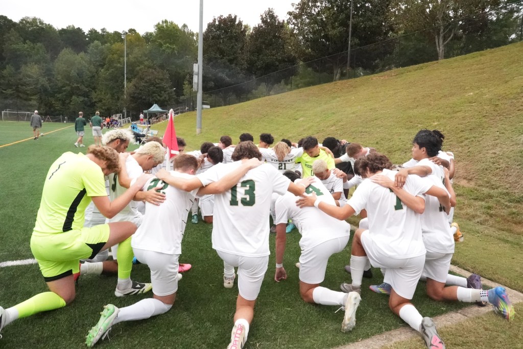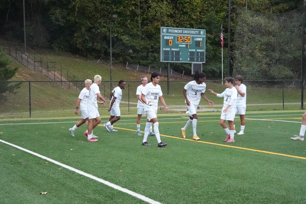 The Piedmont soccer team’s first goal of the game against Ausbury. This was the Piedmont teams first celebration after 15 minutes of intense plays between the two teamsPiedmont Soccer team prayer before the game starts. They pray before every game for good faith and good luck to succeed in the upcoming game. Ball control between one Ausbury player and two Piedmont players within the midfield. This was during the first half of the game when Piedmont was one point to zero. The intense and well-paced passes during this game was a pleasure for the audience to watch.