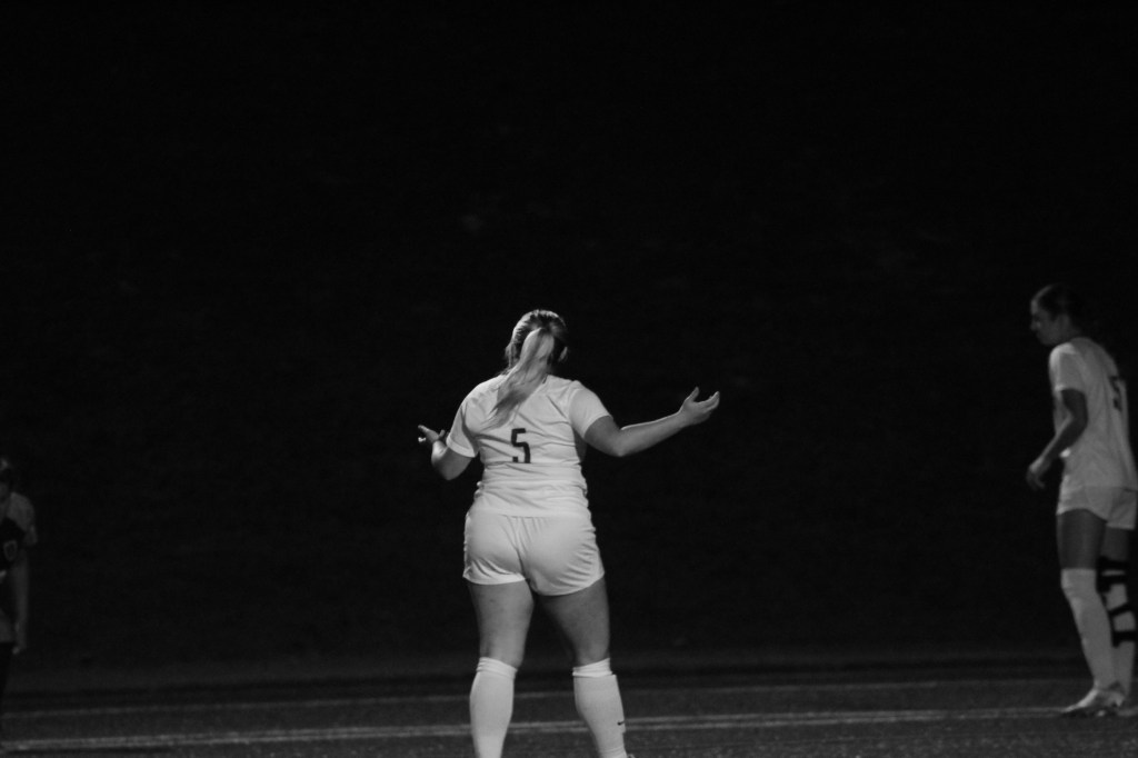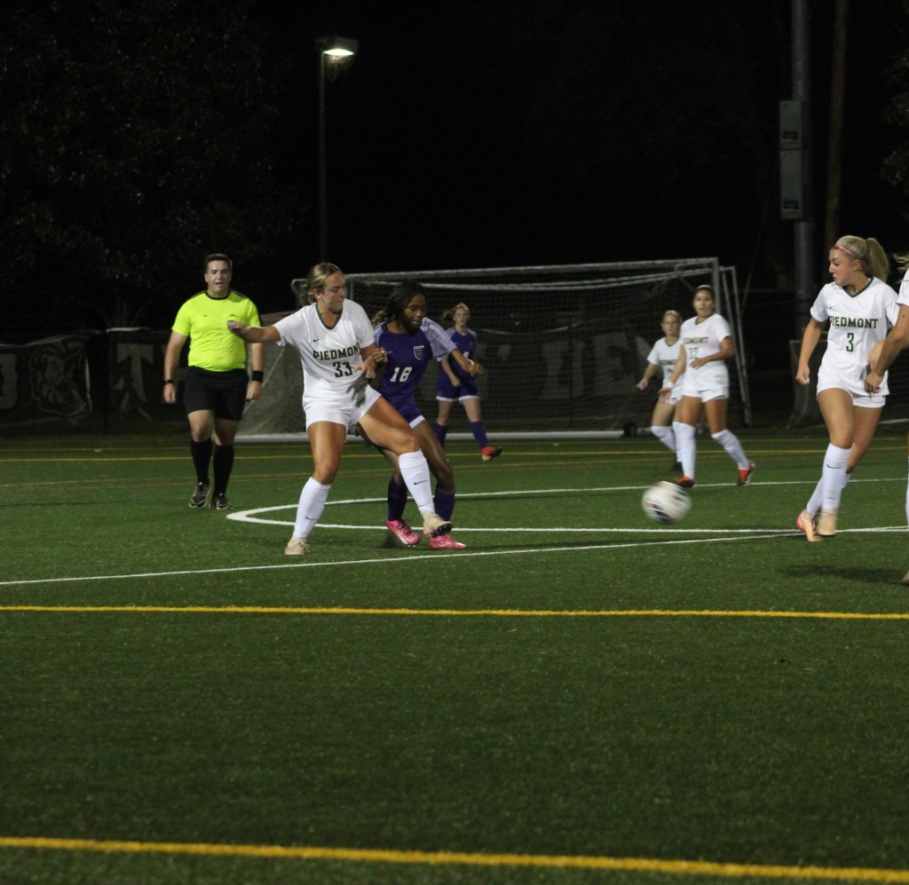 Under the lights, senior Peyton Gates brings veteran focus to the Piedmont back line against Agnes Scott.