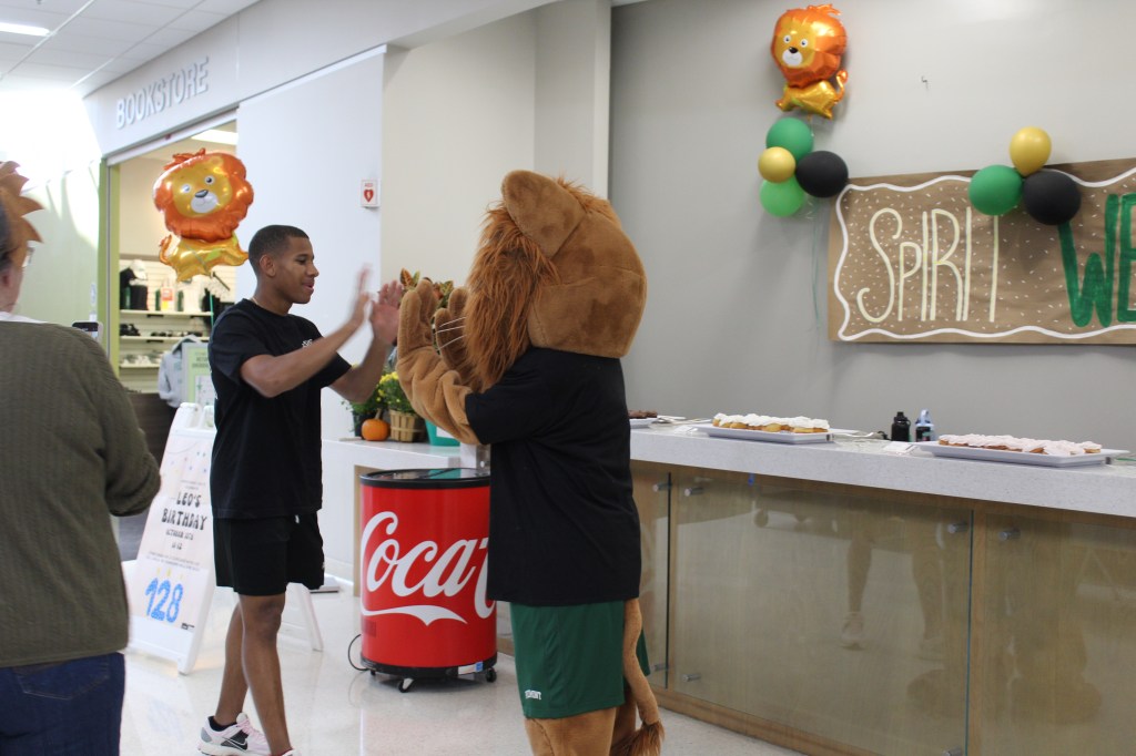 Sophomore Davin Miller shares a high-five with Leo the Lion at Piedmont University’s 128th birthday celebration for the beloved mascot.