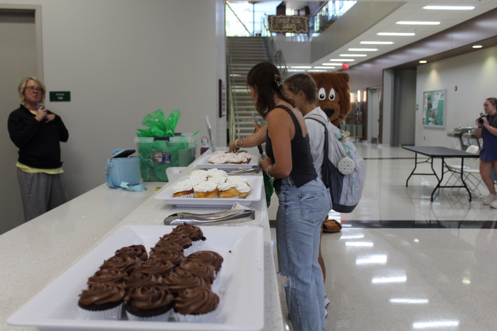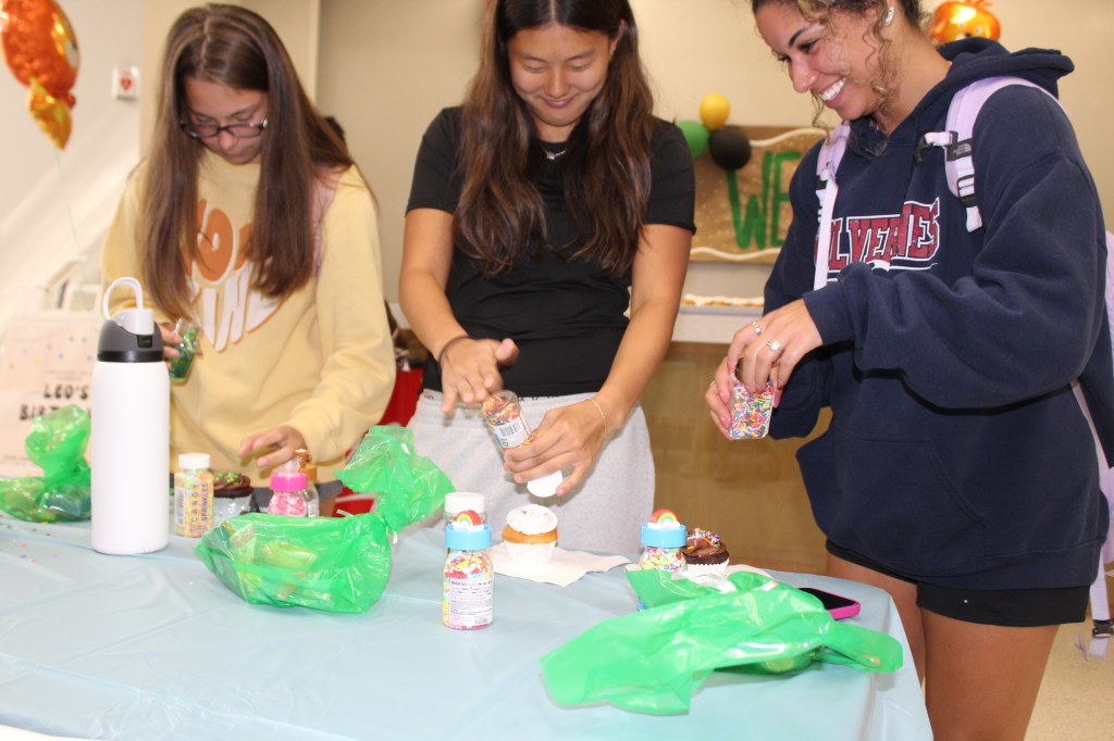 Sophomore Aliyana Boyd-Feuerstein and freshman Lora Kim decorate cupcakes with colorful sprinkles during Piedmont University’s celebration of Leo’s 128th birthday.