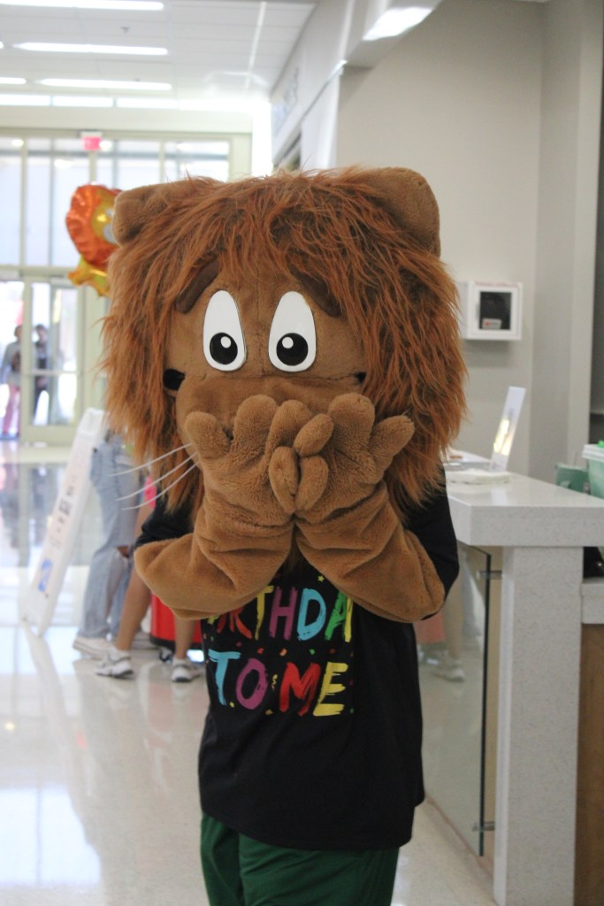 Piedmont University’s mascot, Leo the Lion, strikes a bashful pose during his 128th birthday celebration in the Student Commons.Junior Kate Sanderlin takes a selfie with Leo the Lion during the birthday celebration. Students lined up throughout the afternoon to strike a pose and share birthday wishes with their adored mascot.Leo the Lion locks hands with staff member Terrie Ellerbee as he makes his way to his 128th birthday celebration, ready for a day full of fun and festivities.A student adding the finishing touches to a delicious cupcake at Leo’s 128th birthday celebration.Piedmont student Sarah Sanabia wishes Leo a happy birthday.