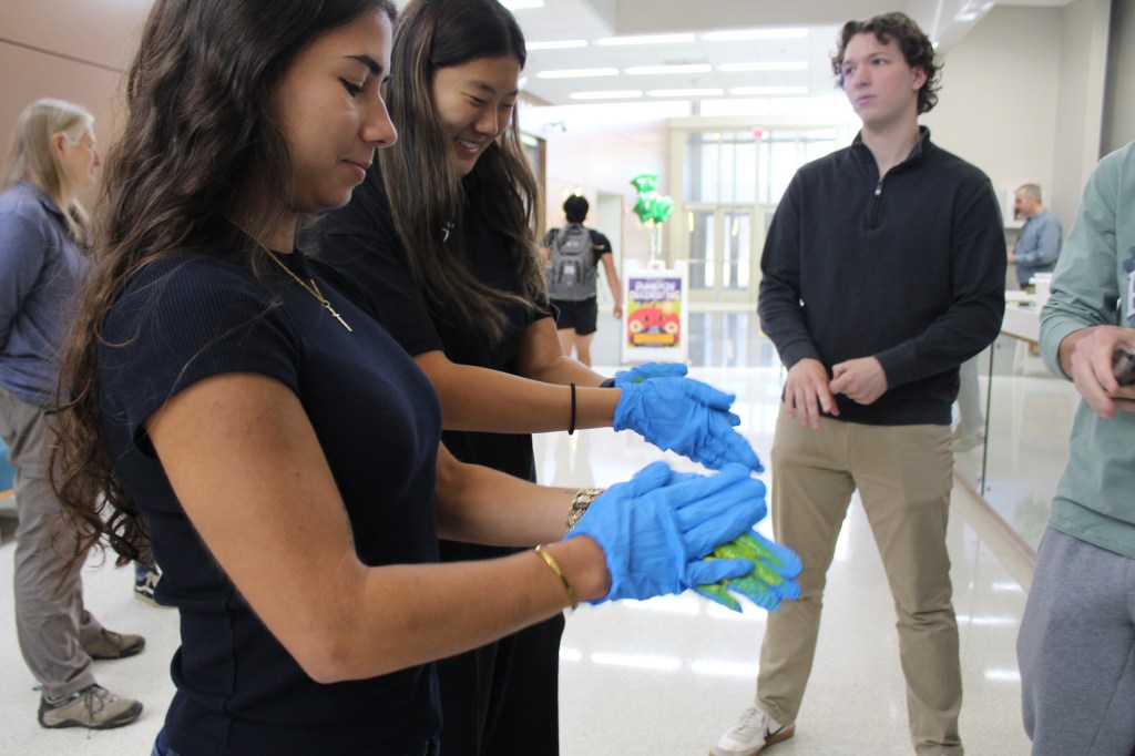 Christina Kim and Lora Kim put on gloves, close their eyes, and rub paint around like they are washing their hands to test how well they can clean them. The activity was part of Global Handwashing Day, which helped students learn proper hygiene techniques in a fun and interactive way.