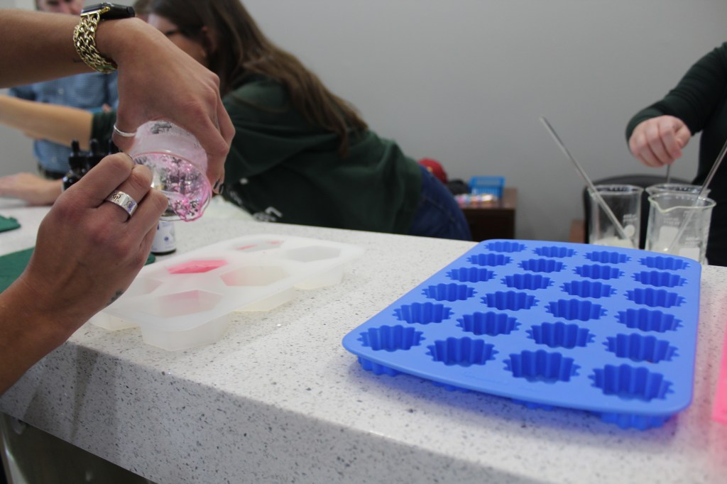 Christina Sierra carefully pours her freshly made soap mixture into a mold during the Global Handwashing Day event. Students were guided through the soap-making process to better understand the importance of handwashing and how soap works to remove germs.