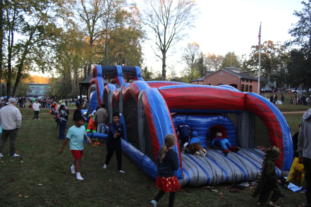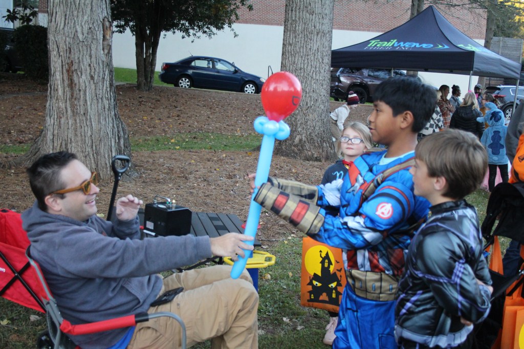 Balloon artist gives kid wearing Captain America outfit a balloon in the shape of a lolipop. The large line of children in their own outfits waiting to get their own custom-made balloons.Children in costumes paint and draw on an interactive art truck during the event. A parent stands nearby as kids add colorful designs and funny memes to the vehicle. The activity draws families to the area, creating a lively and creative atmosphere at the celebration.Kids in costumes crawl, climb, and race through the bouncy house, while families watch nearby. The event draws a big crowd across the park, filling the evening with fun and laughter