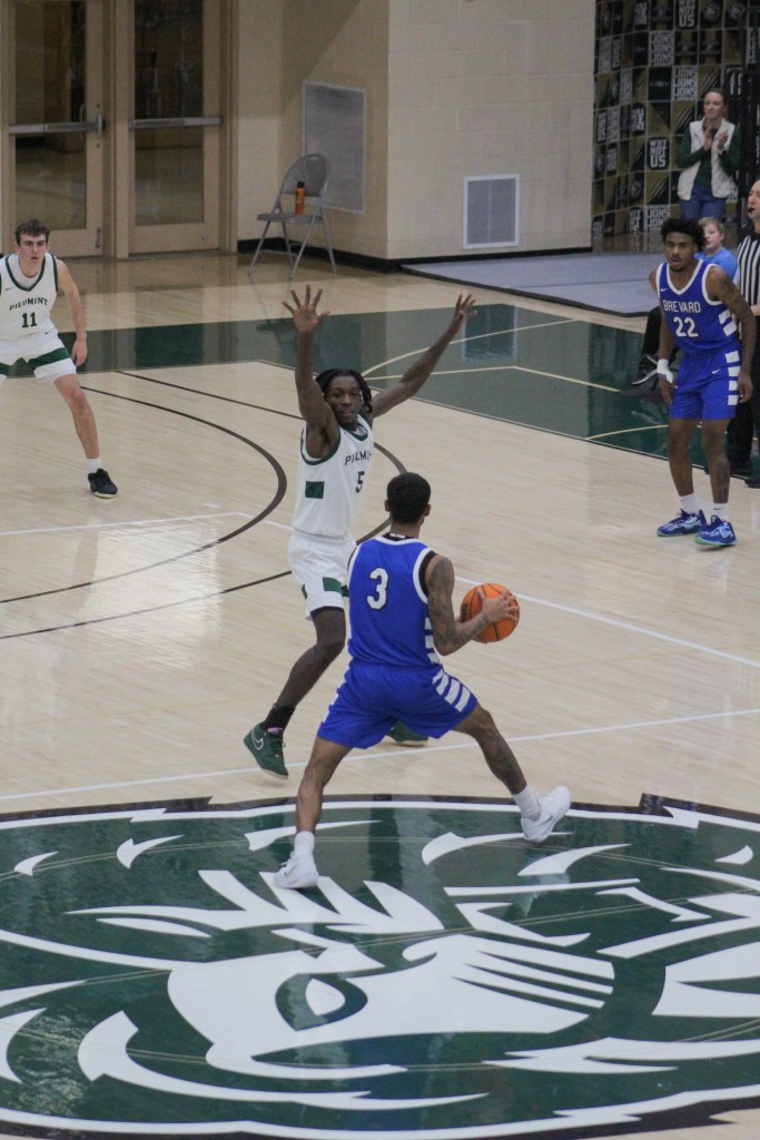 senior #15, Dylan Patrick trying to drive past #5 from Brevard.Junior #2, Isreal Hall, with a bounce pass to Senior #22, Silas MulliganGraduate student, #5, Javi marlowe putting pressure on #3 from BrevardSophomore #1, Jackson Houston, taking a deep breathe before shooting a free throw from the line.