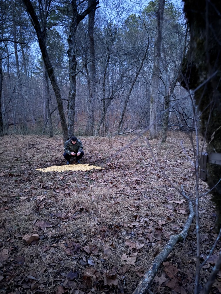 Matt is setting up his camera on the perfect tree with the hope a bunch of deer pass by. This is called a scrape. It is a type of sign that Bucks leave on the ground to communicate and mark territory. Matt now knows he is in the perfect location.Matt sets out corn in front of the camera to feed the deer so they get used to coming and feeding at that locationHe makes sure the corn is positioned directly in front of the camera so when the deer show up, he gets the perfect picture Matt checks his camera app to see what and how many deer have passed by, so he will know his target deer for his future hunts. The landscape around the camera and the corn is important. He set up his stuff next to the river where the deer can come and get a drink. With all the work that is involved during the hunting process, it makes the end result so much better. Matt gets his first deer which he says was “So rewarding.”